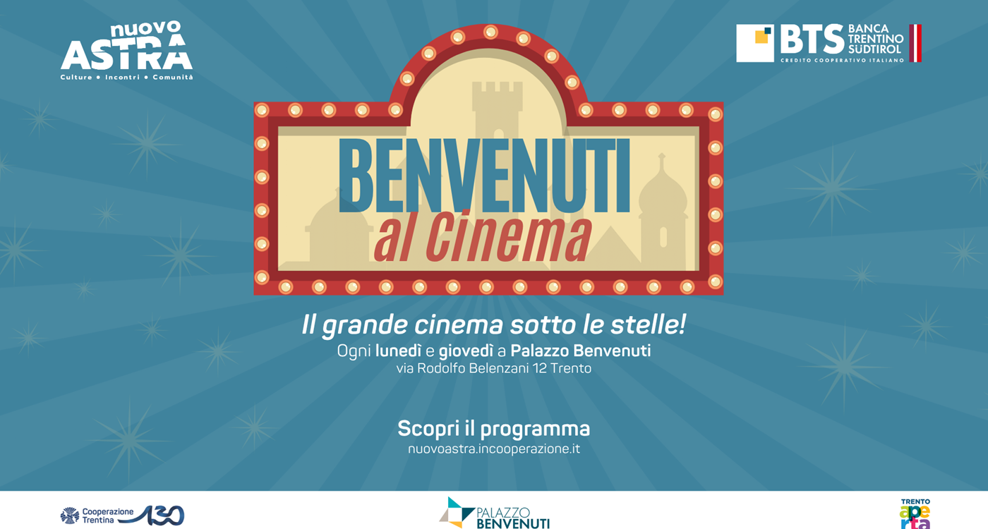 Alle ore 21.15 di lunedì 14 luglio prenderà il via la quarta edizione di “Benvenuti al Cinema” ospitata nella corte di Palazzo Benvenuti, sede di Bts – Banca Trentino Sudtirol, main sponsor del calendario di proiezioni pensato e curato da Nuovo Astra in collaborazione con Federazione Trentina della Cooperazione.